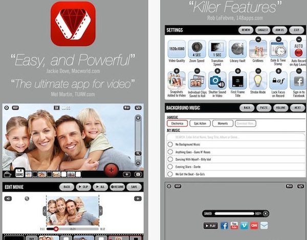 One of the most famous video editing softwares out there, iMovie is now part of the Apple’s iLife suite for iPhone and iPad. Editing movies is really pretty simple in iMovie. You can preview clips by simply dragging your finger across them. You can then trim the edges before adding them to your project. Adding music to your videos is a bit of a hassle as you cannot add more than one song to your movie unless your movie is long enough to play an entire song. You can then have a new song start after the first one is finished, but you cannot control the length of the clip nor choose when you want the song to start. The newest and by far the coolest feature added to the iMovie is the ability to make trailers — credits and all! You need to choose one between 9 different themes: Bollywood, Expedition, Fairy Tale, Narrative, Retro, Romance, Scary, Superhero, and Swashbuckler. A few tweaks here and there and you have your own movie trailer. Cool! Right? All these cool features and the reasonable pricing of $4.99 make iMovie the one app that you must have in your app collection.