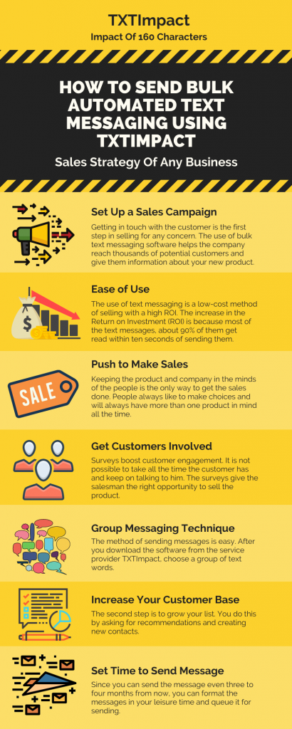 Bulk automated text messaging is an intrinsic part of the sales strategy of any business. The use of media to corner the market is now the rule rather than an option. The advantage of using an automated text message is that you get rid of the tension and streamline your sales strategy with ease. The only thing you have to do is to prepare the messages and line them up for sending. The use of a good, reliable messaging service provider like TXTImpact helps you do this and much more.